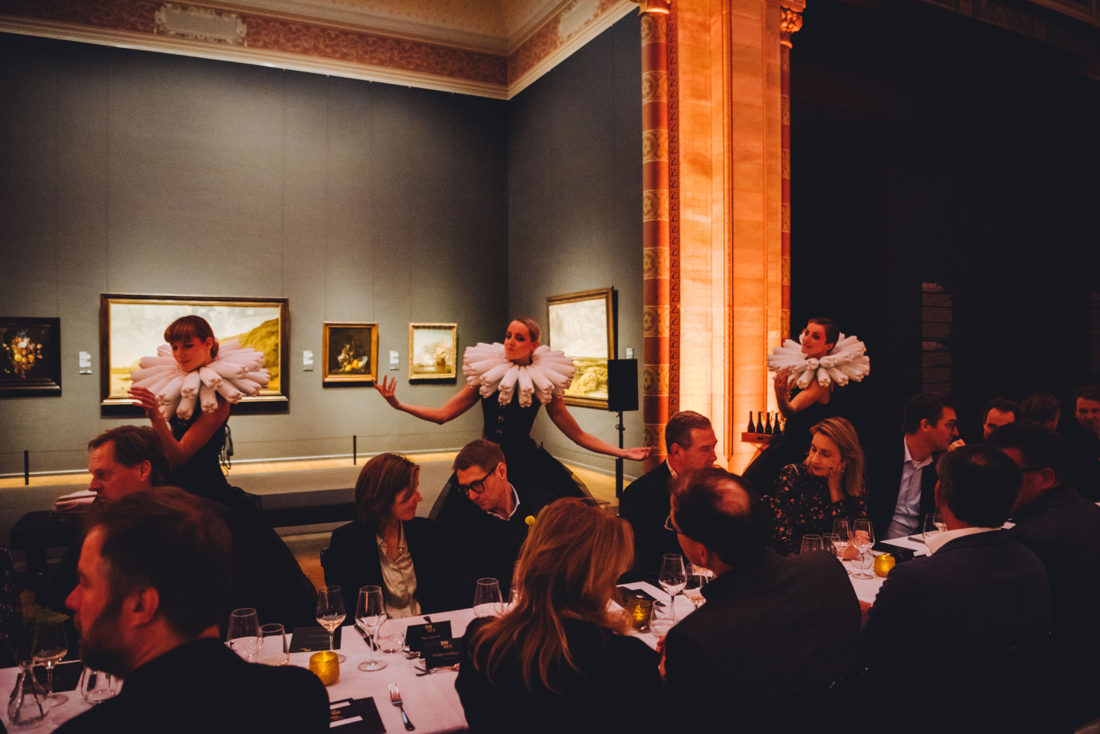 Na een korte rondleiding door de tentoonstelling Rembrandt-Velasquez werden de gasten bij het openen van de deuren op buitengewoon chique wijze welkom geheten door drie wonderschone danseressen in modieuze gouden eeuw kostuums.